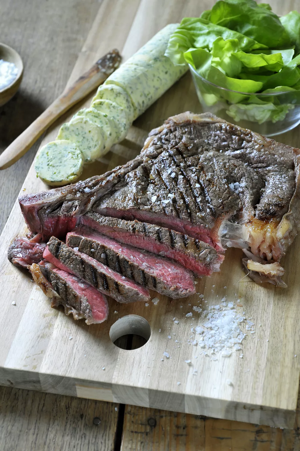 Haal de stukken cote à l’os uit de oven. Verwijder het been en snijd de rest van het vlees in schuine plakjes. Kruid af met een klein beetje peper en zout. Serveer samen met de hofmeesterboter en de met vinaigrette overgoten sla.
