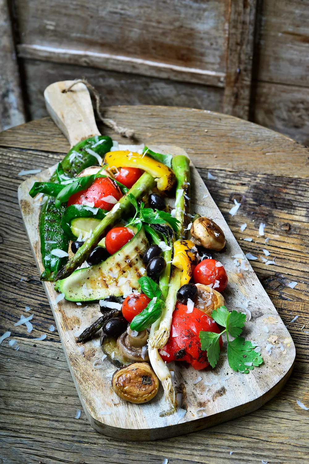 Pel net voor het serveren de paprika’s en verwijder de pitjes. Schik alle gegrilde groenten op een grote plank of in een schaal. Werk af met verse kruiden, olijfjes en Parmezaanse kaas.