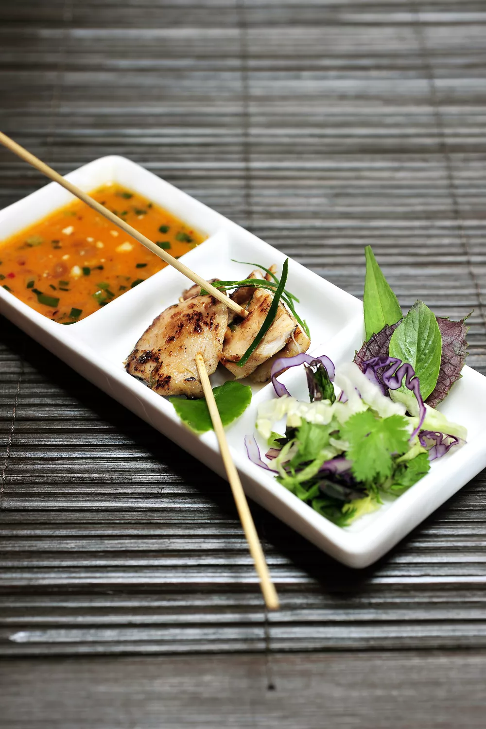 Maak de marinade door het citroengras te mengen met knoflook, vissaus en suiker. Haal de kip door deze marinade.