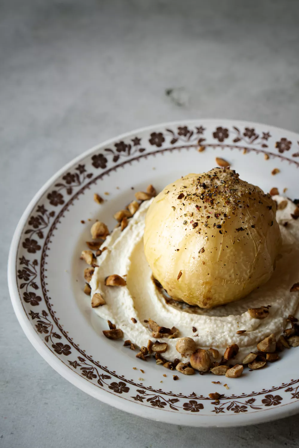 Gegrilde koolrabi met mierikswortelsaus en geroosterde hazelnoten