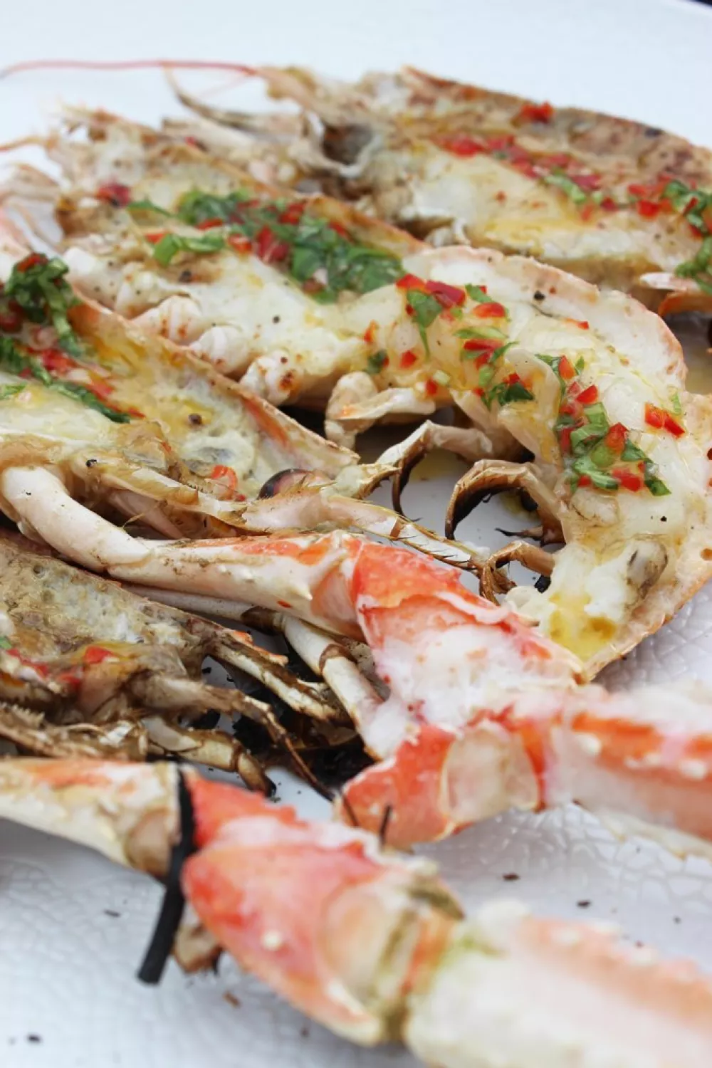 Gegrilde langoustines met een dressing van rode peper en basilicum