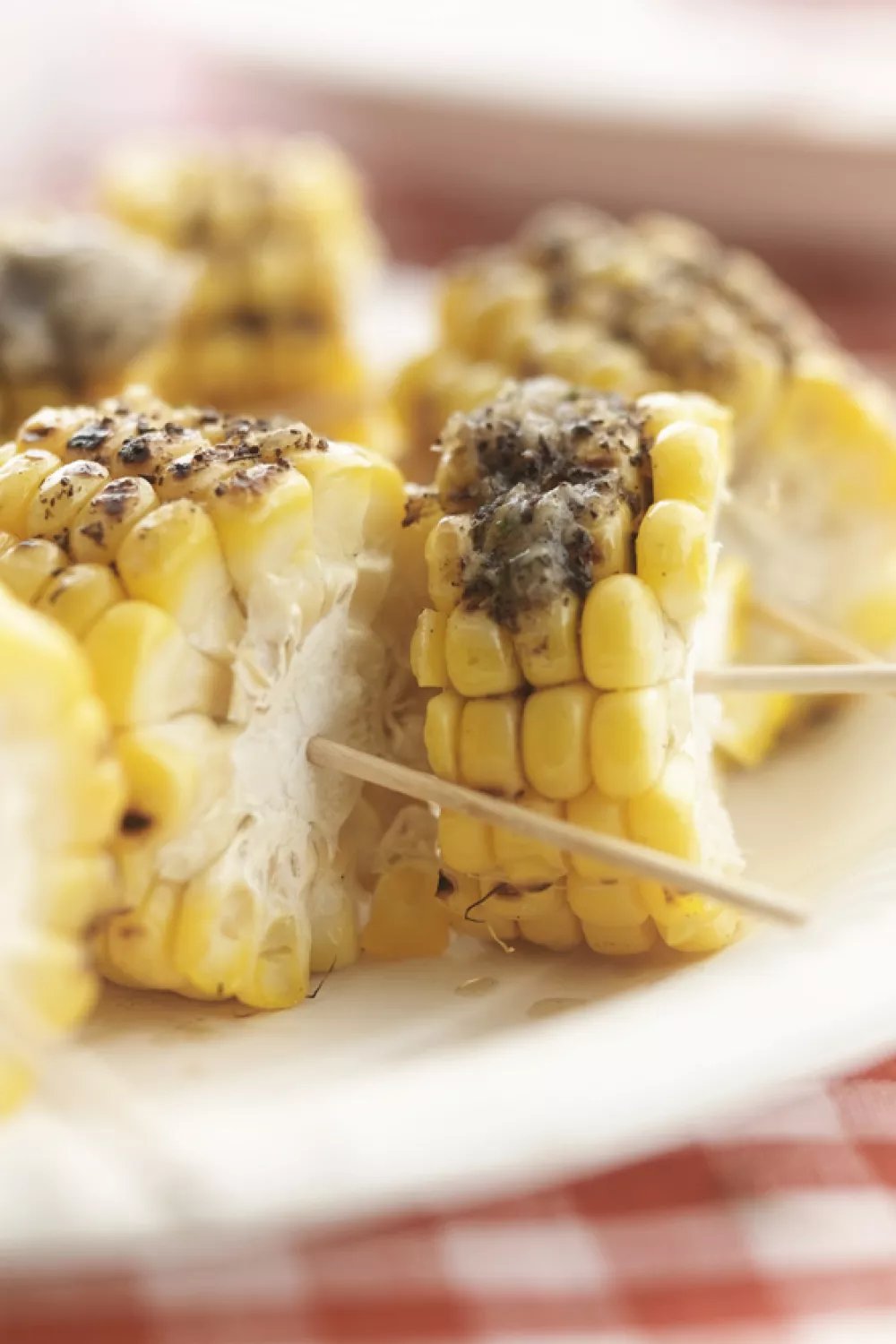 Snijd de boter in schijfjes en laat ze op het bord over de maïs smelten. Serveer als hapje met een houten prikkertje.