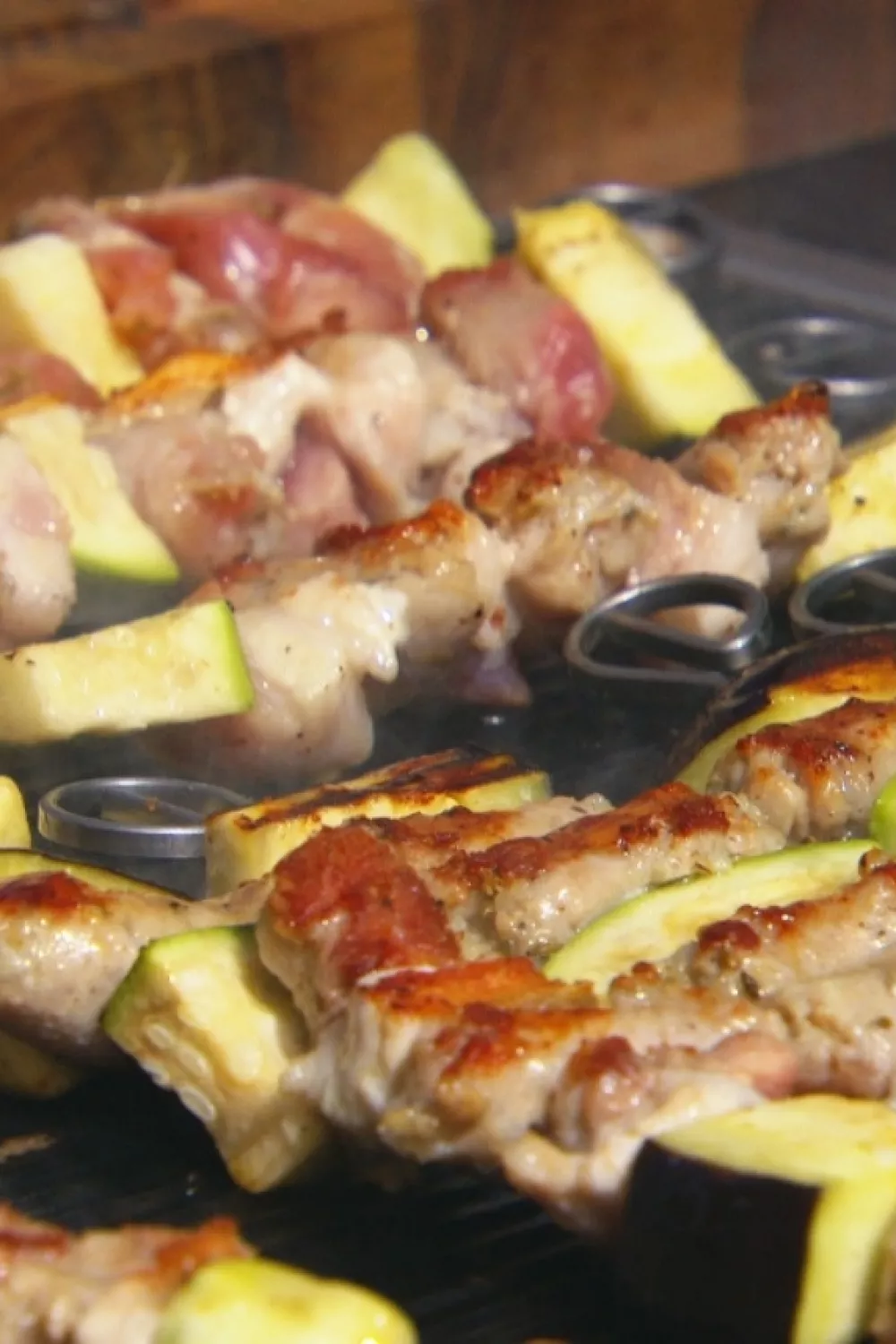Maak spiesjes van de stukken worst, buikspek, aubergine en courgette. Marineer met olijfolie en kruid met peper en zout.