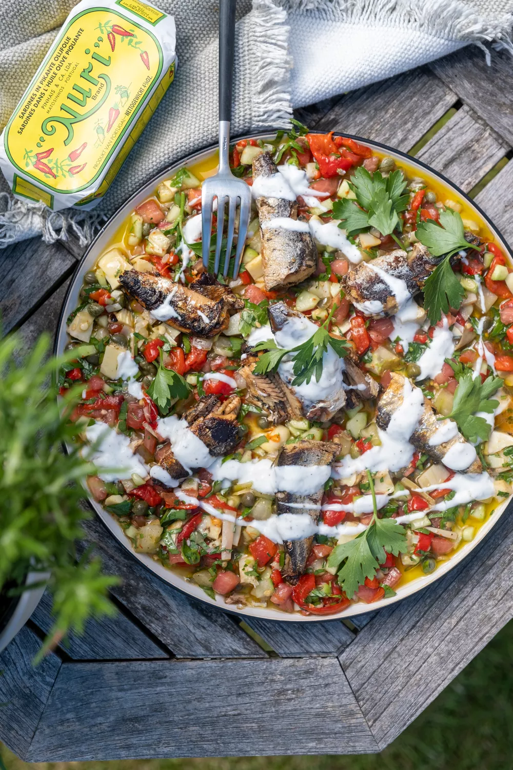 Rokerige gegrilde sardines ontmoeten een frisse tartaar van puntpaprika, tomaat, komkommer, artisjok en kappertjes voor een smaakvol, mediterraan gerecht. Afgewerkt met limoen, platte peterselie en een knoflookyoghurt krijgt het geheel een levendige, zomerse toets. Perfect als lichte lunch of borrelhap bij warm weer en als feestelijk visgerecht van de grill.