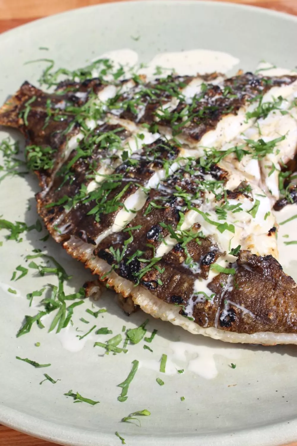 Haal de tarbot van de grill en leg de vis in zijn geheel op een groot bord. Overgiet met de botersaus en werk af met verse fijngehakte peterselie.