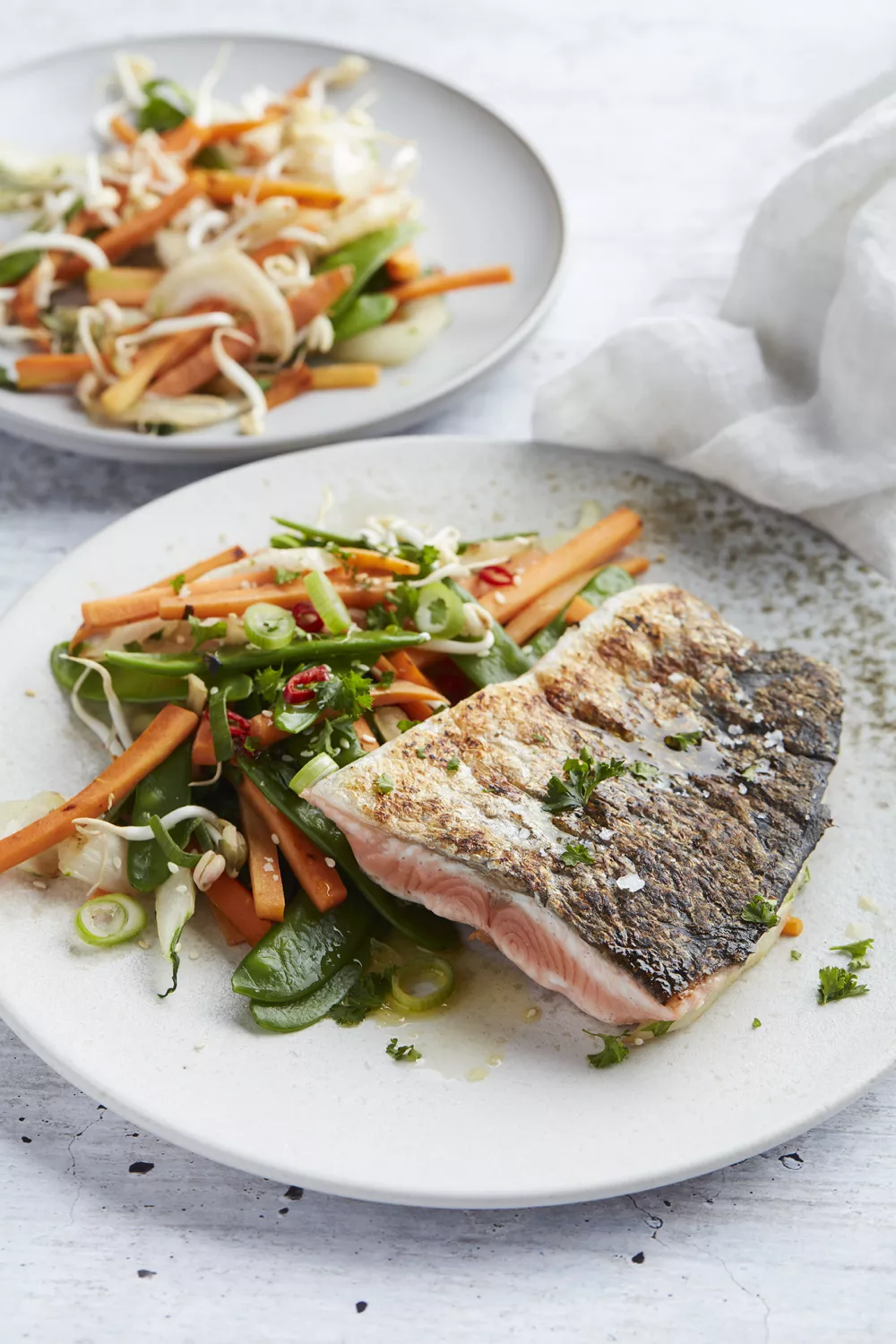 Verhit ondertussen een tweede pan met kokos- of olijfolie en bak de zalm gaar in 6 à 10 minuten. Kruid met peper en zout. Serveer de groenten met de zalm. Werk eventueel af met koriander of peterselie, sesamzaadjes, fijne reepjes lente-ui, geraspte gember en chilipeper (zonder zaad).