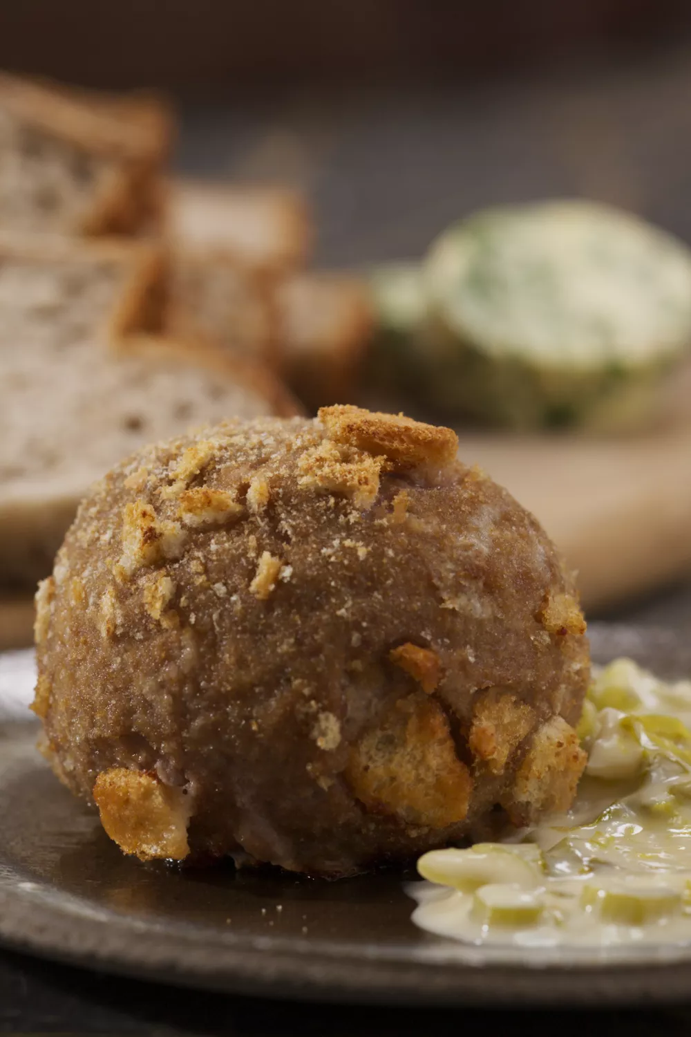 Een ovengebakken gehaktbal gevuld met krokant spek en zoete ui, geserveerd met een romige seldersaus en smeuïge kruidenboter, brengt warmte en smaak aan tafel. De vulling wordt kort aangebakken en ingevroren voor perfecte, volle bolletjes en de korst krijgt zijn goudbruine bite door paneermeel van beschuit. Perfect als hartige herfst- of wintermaaltijd bij vers brood en een glas witte wijn.