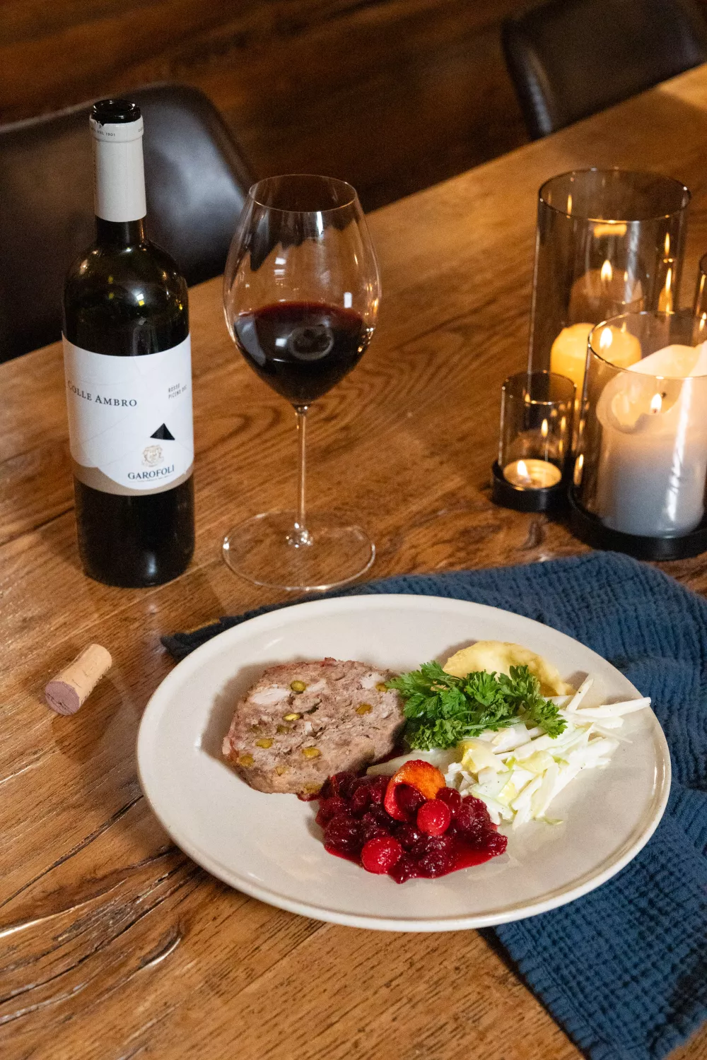Garofoli, Colle AmbroEen blend van Sangiovese en Montepulciano met een perfecte balans tussen rondheid en intensiteit. Ideaal bij het zachte gehaktbrood en aromatische foie gras.