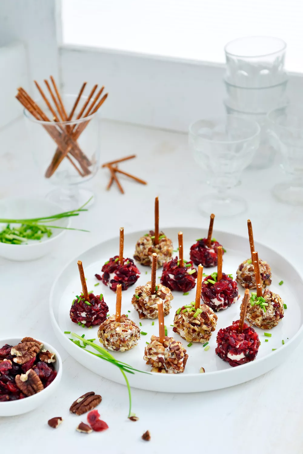 Maak kleine balletjes van het geitenkaasmengsel en rol ze door de fijngehakte pecannoten of de fijngehakte cranberries. Breek elk zoutstokje in twee en steek ze in het midden van elk geitenkaasballetje. Werk tot slot af met fijngesnipperde bieslook.