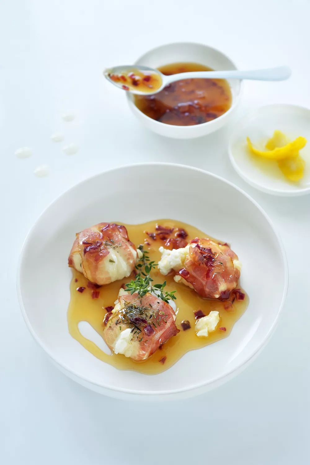 Romig geitenkaasje, al dan niet omwikkeld met spek, krijgt een glanzend honingsausje met frisse citroen en aromatische tijm en wordt afgewerkt met een zachte beurre blanc. De kaas gaat kort de oven in terwijl fijngehakte ui, ciderazijn en honing inkoken en beetje bij beetje tot een romige saus worden opgeklopt met koude boter. Perfect als warm voorgerecht of borrelhapje bij een zomerse barbecue of als feestelijke starter in elk seizoen.