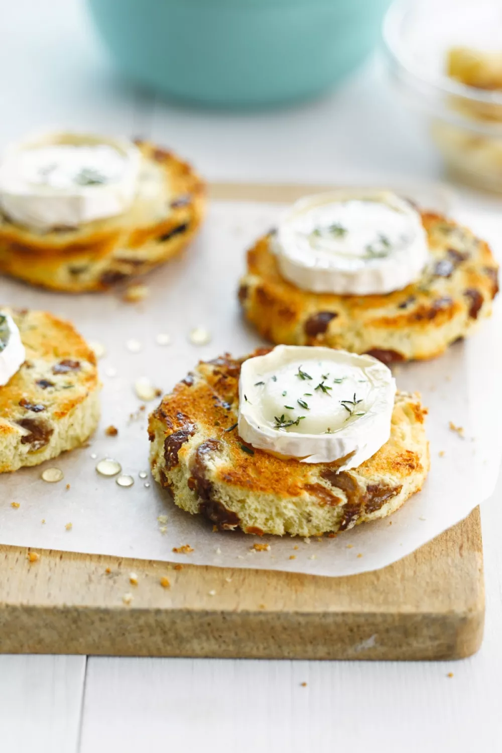 Steek uit het brood 4 rondjes. Toast het brood kort in de broodrooster of onder de grill. Snij de kaasjes middendoor en leg op iedere toastje een half kaasje. Rits de blaadjes van de tijm en verdeel ze over de kaasjes. Lepel de honing over de kaasjes. Schuif ze 1 minuutje onder de grill.