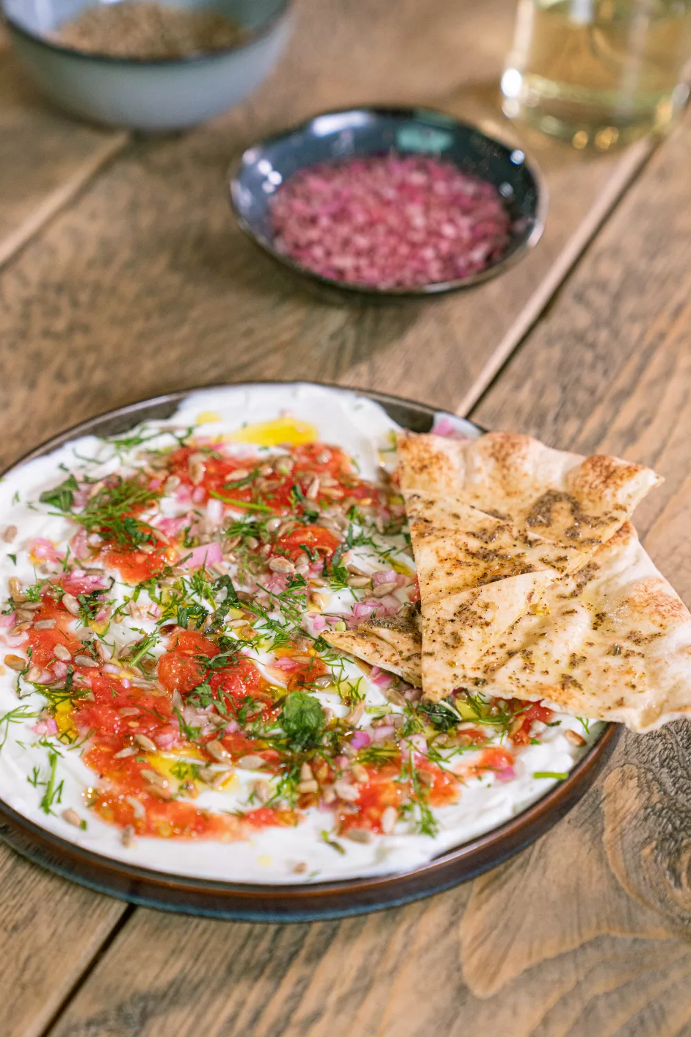 Verdeel de labneh over een bord en strooi er de ingelegde sjalot over. Lepel er vervolgens de tomatendressing, de geroosterde zonnebloempitten, de munt, de dille en wat olijfolie over. Bestrijk het platbrood met de za’atar boter en snijd in stukken. Serveer de labneh samen met het platbrood.