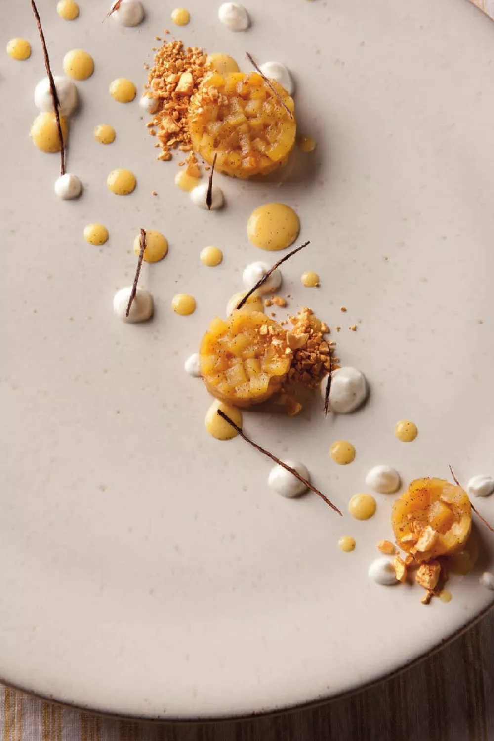 Spuit het bord vol met dotjes mascarponecrème, crème anglaise en vul 3 ringen van verschillende grootte met gekaramelliseerde appel. Werk af met de gekonfijte vanillestokjes en de gouden hazelnoten.
