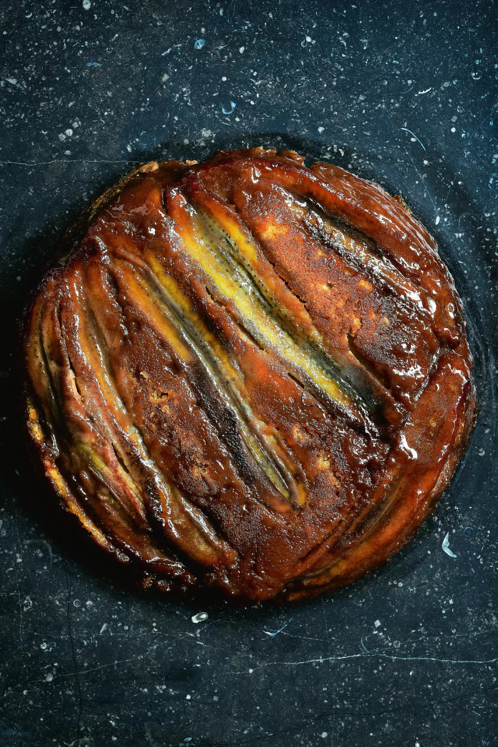 Deze gekarameliseerde bananentaart combineert een luchtige karnemelkcake met warme karamel en boterzachte bananen voor een romige en kruidige smaakbeleving. Kaneel en gember geven diepte en een scheutje bruine rum is optioneel voor een feestelijke toets, ideaal voor herfstige avonden, brunch of bij de koffie. De karamel maak je in een ovenvaste gietijzeren pan en na het bakken draai je de cake om zodat de bananen goudbruin en plakkerig blijven.