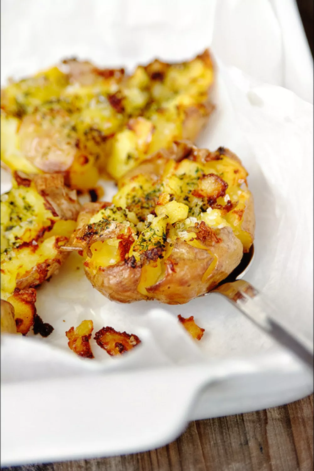 Verwarm de oven voor op 220 graden. Giet de aardappelen af en laat ze in 5 minuten droog stomen. Leg ze op een licht ingevette bakplaat en gebruik een stamper om de bovenkant van de aardappelen te breken. Zorg dat je ze niet helemaal doorbreekt. Verdeel de boter over de aardappelen en strooi er wat grof zeezout op. Bak ze in de voorverwarmde oven in 20 minuten goudbruin.