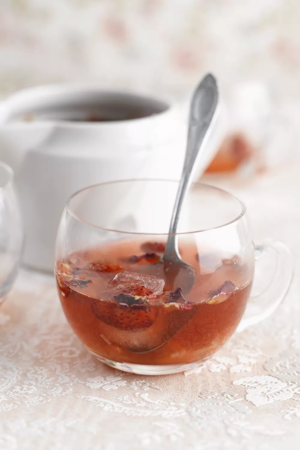 Schenk intussen kokend water op het theebuiltje en voeg de rozenblaadjes toe. Laat het builtje enkele minuten trekken en breng de thee daarna op kamertemperatuur.