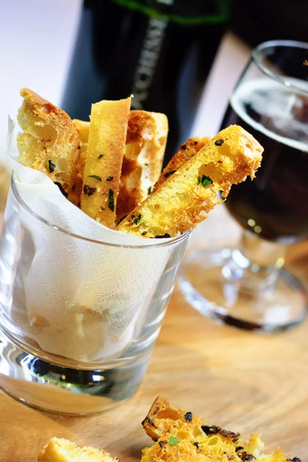 Knapperige gekruide broodstengels met ciabatta, knoflook, zongedroogde tomaat en veel olijfolie, een eenvoudig Mediterraan borrelhapje vol smaak. Meng olijfolie met geraspte knoflook en fijngehakte peterselie, masseer de dunne repen ciabatta ermee en bak ze in de oven tot ze goudbruin en knapperig. Ideaal als snelle snack bij een zomerbarbecue of als smaakvol bijgerecht bij een Italiaans diner.