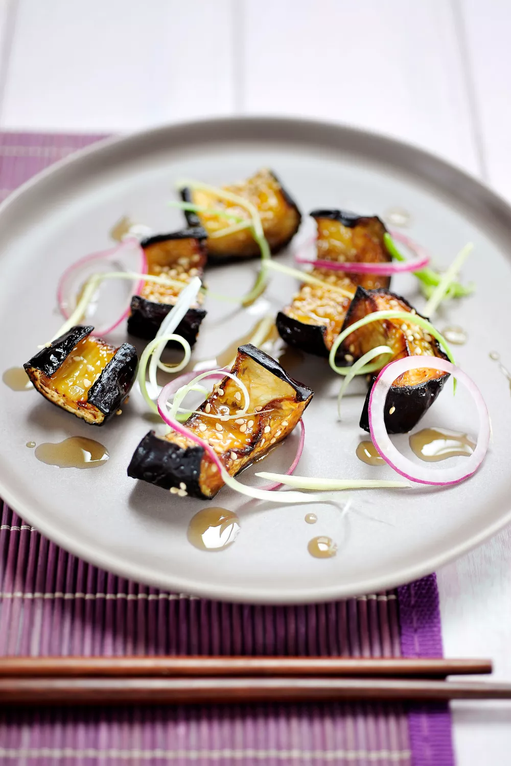 Bestrooi de aubergines met het sesamzaad en schik ze op de borden. Werk af met lente-ui, gember en gemarineerde rode ui en druppel wat sesamolie erover.