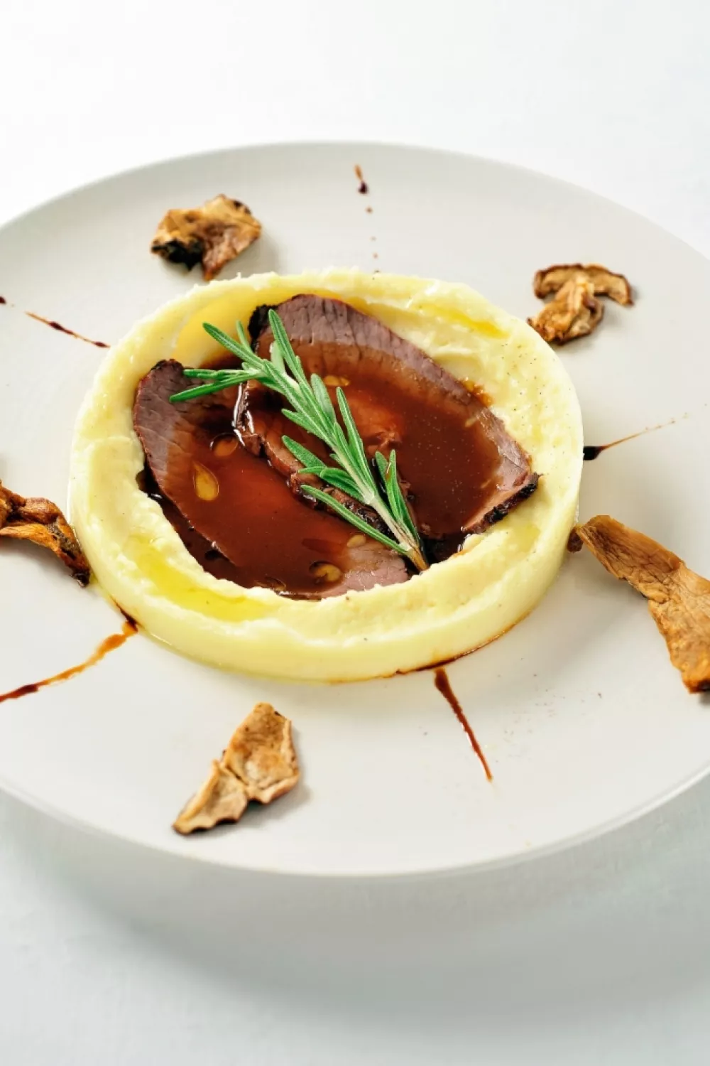 Schep de aardappelpuree op het bord, strijk uit, leg het vlees erop en schep de saus erover. Verdeel de porcini over het bord. Werk af met een scheutje olijfolie, geraspte truffel, een takje rozemarijn, salie en peper.