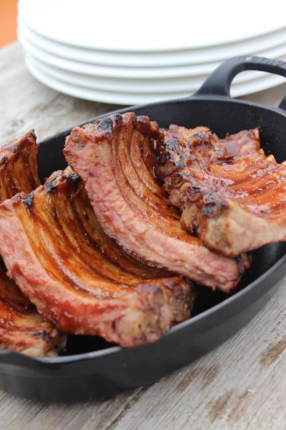 Sappige gemarineerde varkensribbetjes met een zoete en licht pittige lak van Luikse siroop, ketchup en currypoeder, afgerond met kalfsfond voor extra diepte. Kort grillen op de barbecue karamelliseert de saus en geeft een knapperig buitenlaagje met een zacht en sappig hart. Perfect als zomerse snack of hartig hoofdgerecht bij een tuinfeest.