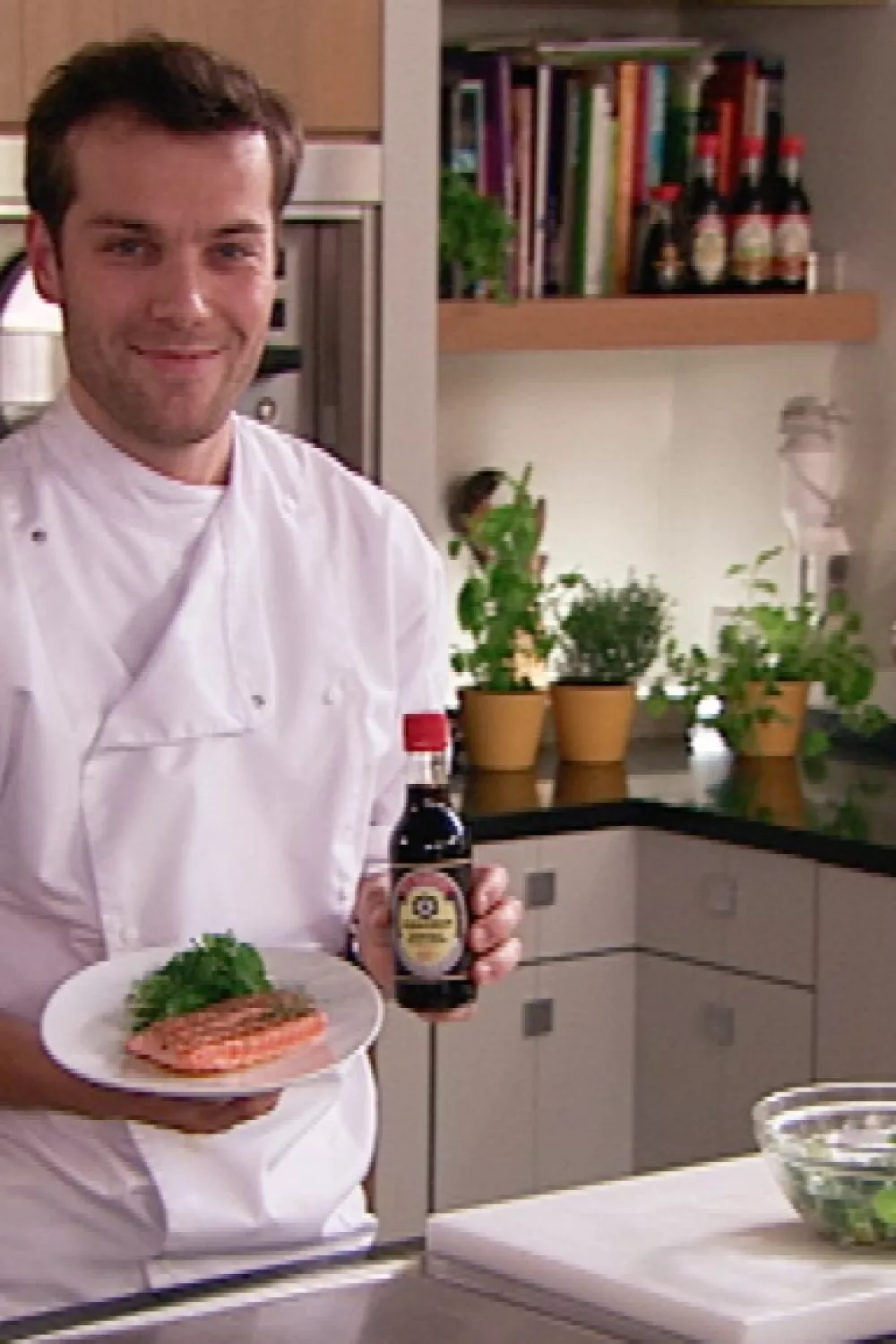 Neem de marinade die overblijft. Vul aan met een lepeltje soyasaus en besprenkel de salade met deze vinaigrette.