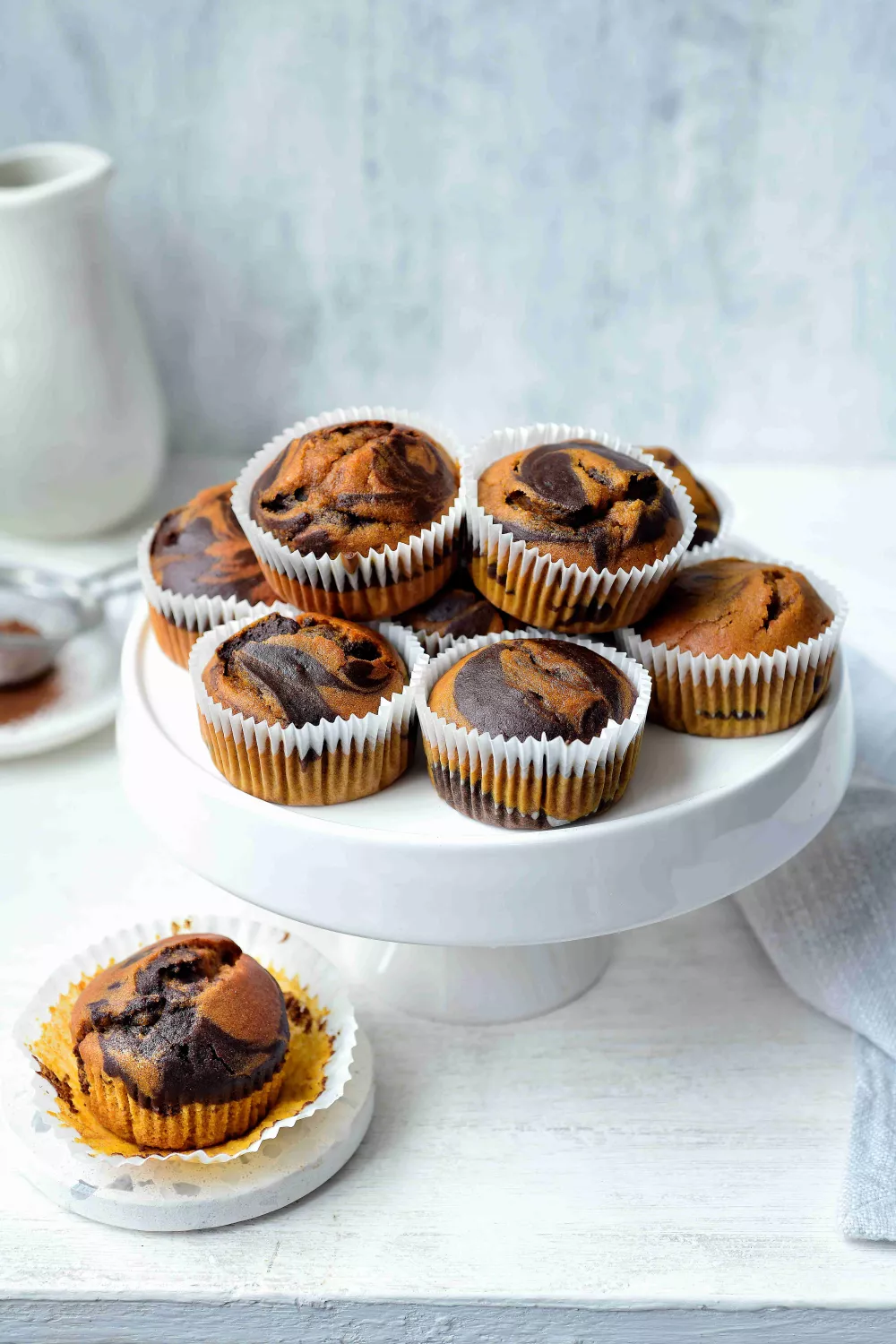 Deze gemarmerde pompoenmuffins combineren zachte pompoenpuree met warme pumpkin spice en een vleug cacao voor een luchtige herfsttraktatie, ideaal voor brunch, picknick of als troostrijke snack. Met zelfrijzend bakmeel, kokosbloesemsuiker en een eenvoudige meng en baktechniek zet je ze snel in de oven. Serveer lauw bij koffie of thee.
