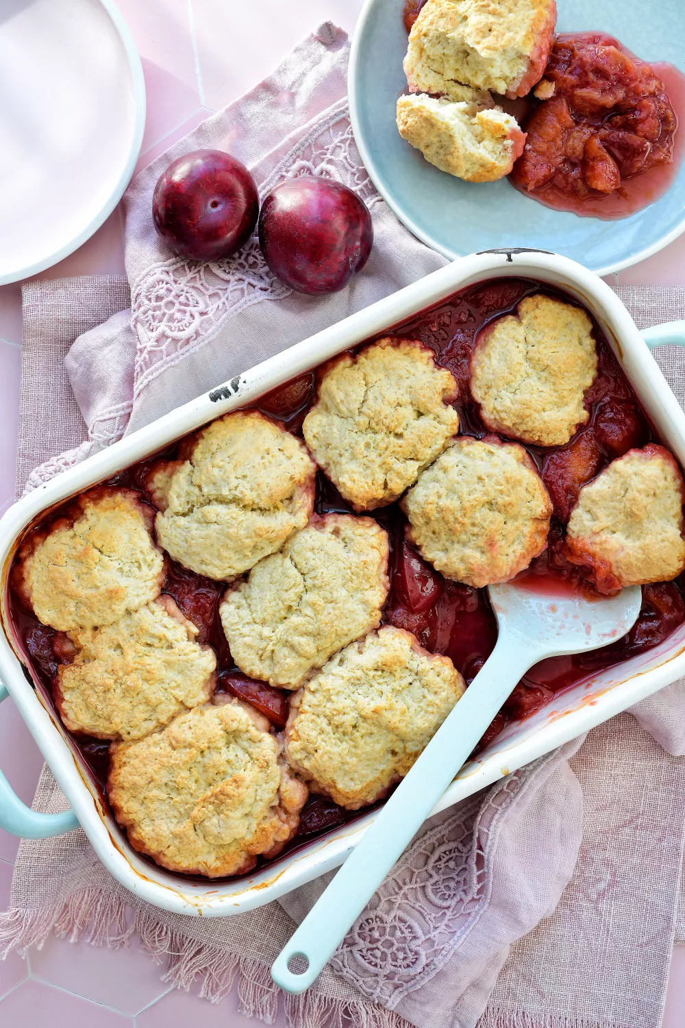 Deze smeuïge gember en pruimen slump combineert zachte, siroperige pruimen met een subtiele pep van verse gember en luchtige deegballetjes. Dit eenvoudige, huiselijke dessert maak je door pruimen te pocheren in een suiker-gembersiroop en de deegballetjes er bovenop te stoven of in de oven te bakken. Perfect voor een gezellige herfsttafel of als zomers nagerecht, lekker warm met een bolletje vanille-ijs.