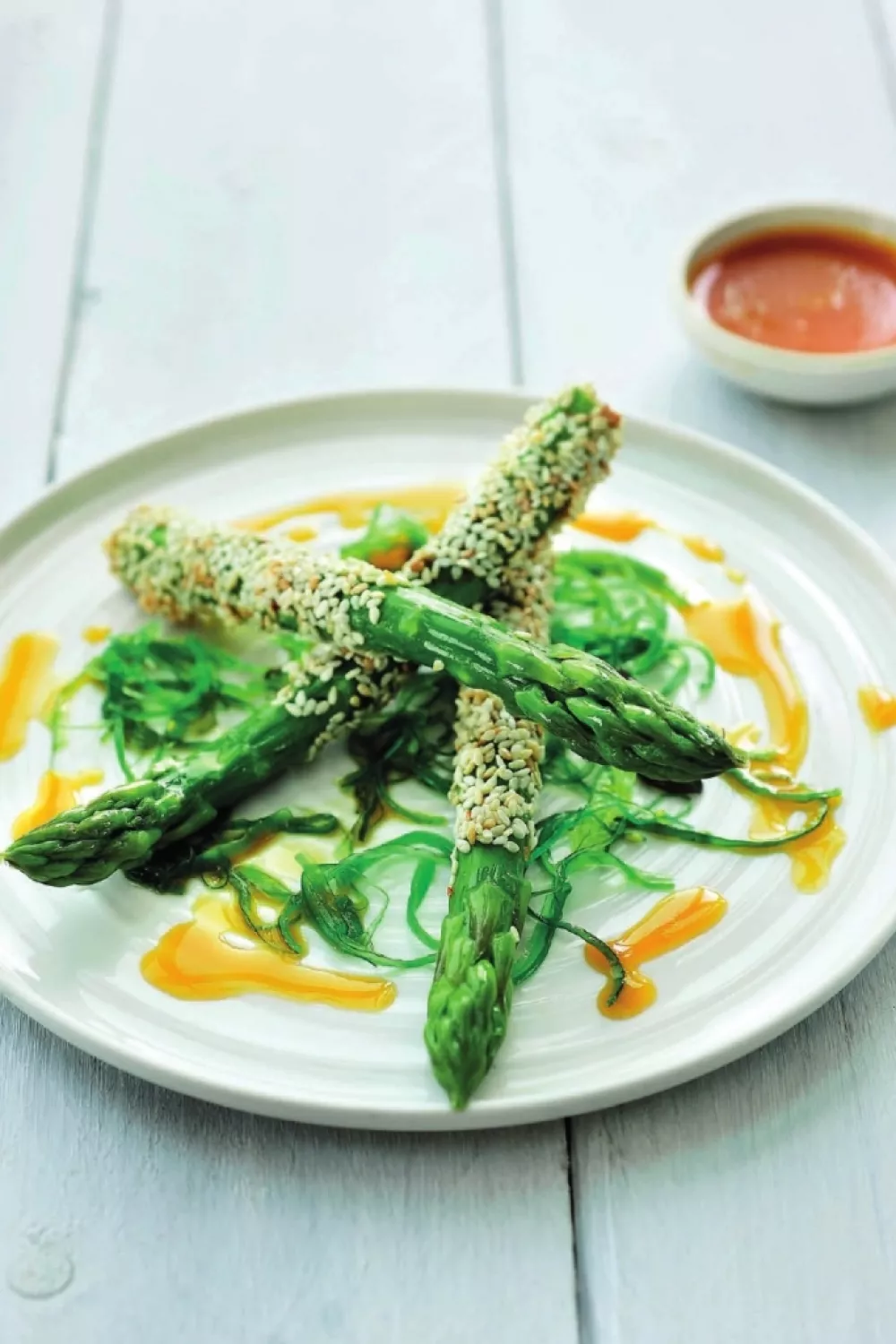Gepaneerde groene asperges met wakame, sesam en Japanse eiersaus