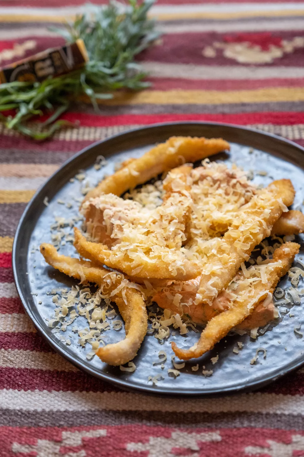 Knapperige gepaneerde kippenreepjes, krokant gefrituurd en geserveerd met een romige tomatencrème van platte kaas en verse dragon. De frisse dragonazijn en geraspte Flandrien kaas geven een kruidige, licht pittige toets die zowel als borrelhapje als snelle lunch of doordeweekse maaltijd werkt. Eenvoudig te bereiden met klassieke paneer en frituurtechnieken, ideaal voor lente en zomer.