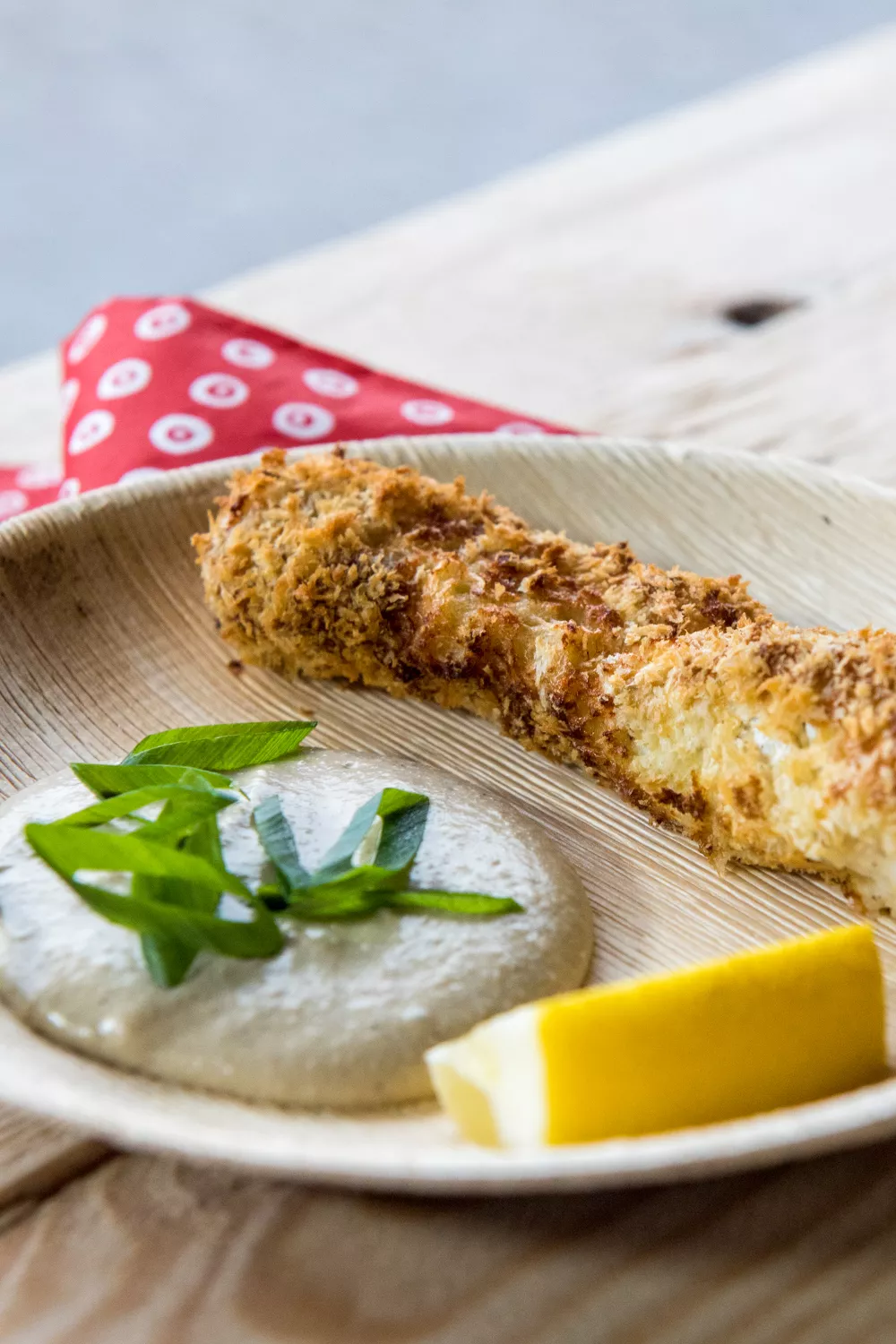 Schik de krokante visreepjes mooi op een bordje. Lepel er wat van de hummus naast. Werk af met een partje citroen en wat fijngehakte lente-ui.