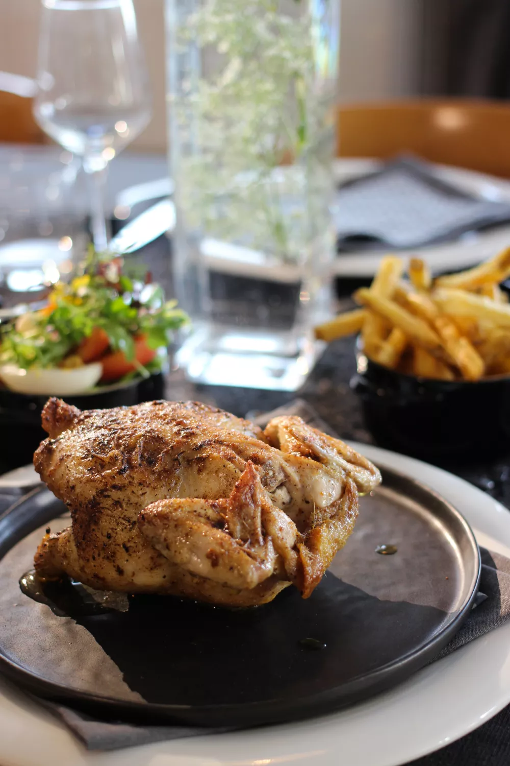 Zacht gepekelde kip met een goudbruine krokante huid en volle, boterachtige smaak, geserveerd met krokante frietjes en een frisse kruidensla met kervel en gekookt ei. Dit recept combineert traditioneel pekelen met ovenroosteren en het frituren van frietjes, en gebruikt citroen, tijm en rozemarijn voor een heldere, mediterrane toets. Perfect voor een ontspannen weekendmaaltijd of gezellig familiediner in elk seizoen.
