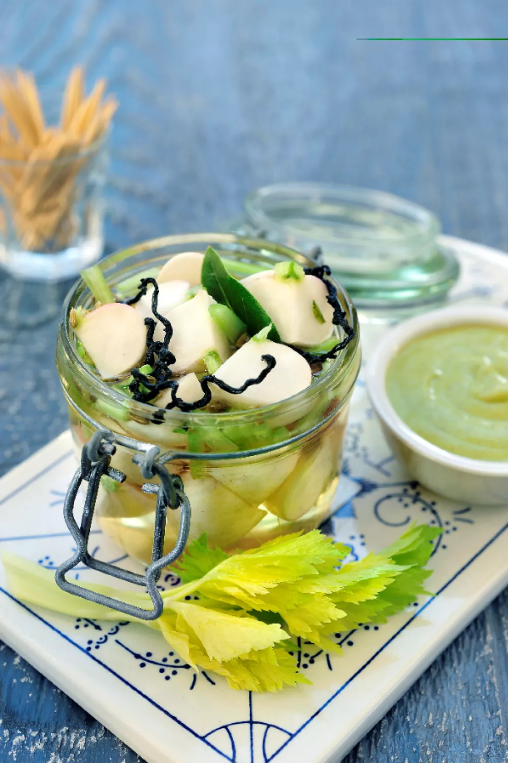 Serveer de gepekelde raapjes met de seldermayonaise als hapje.