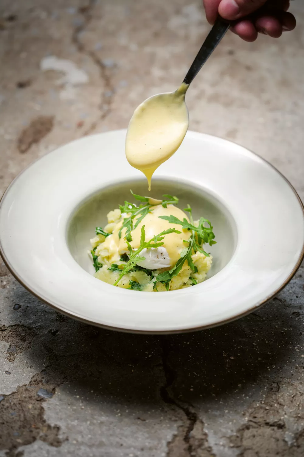 Gepocheerd ei met rucola, geplette aardappel en mousselinesaus