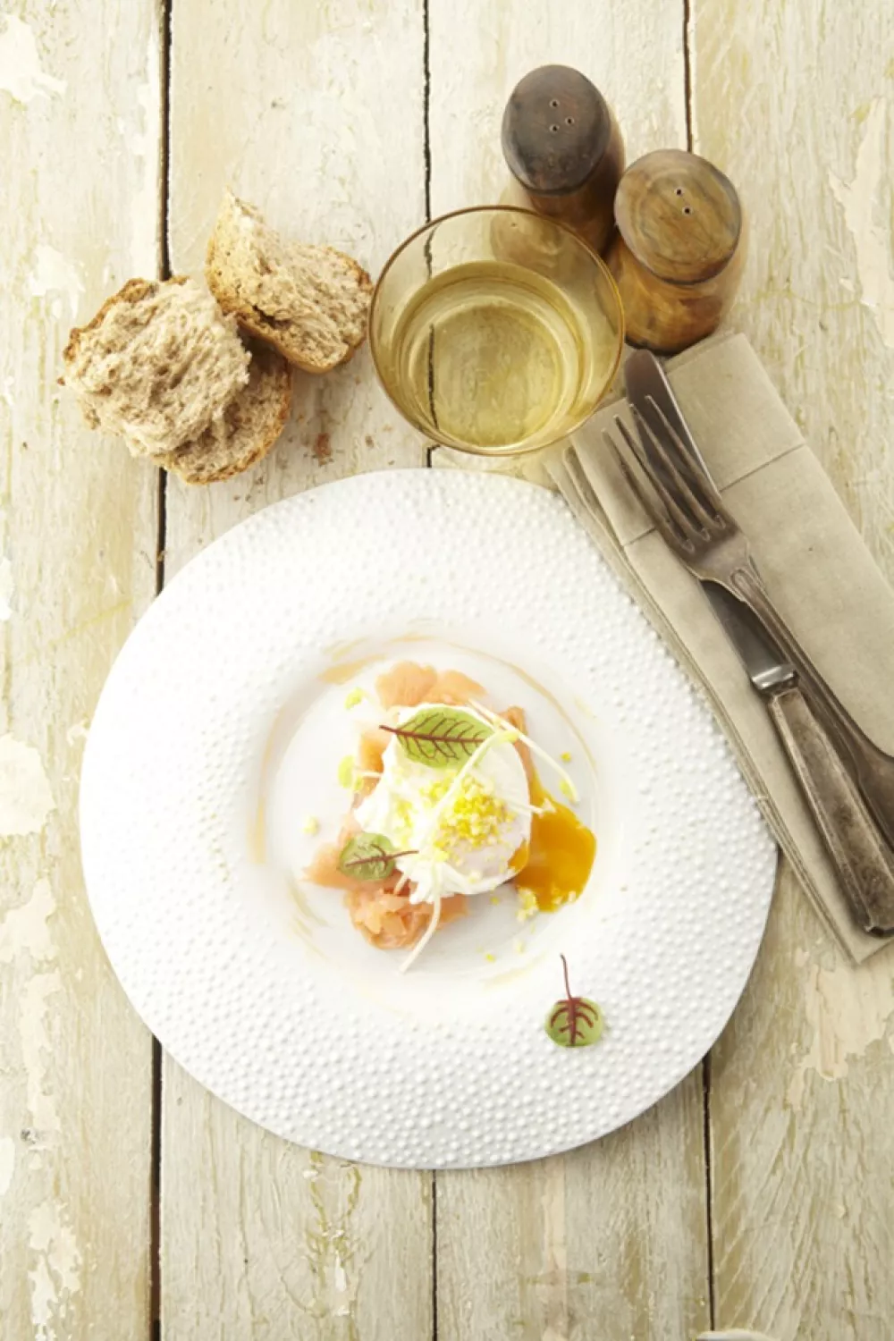 Maak intussen op elk bordje een torentje van de gerookte zalm en serveer er bovenop het gepocheerde ei.