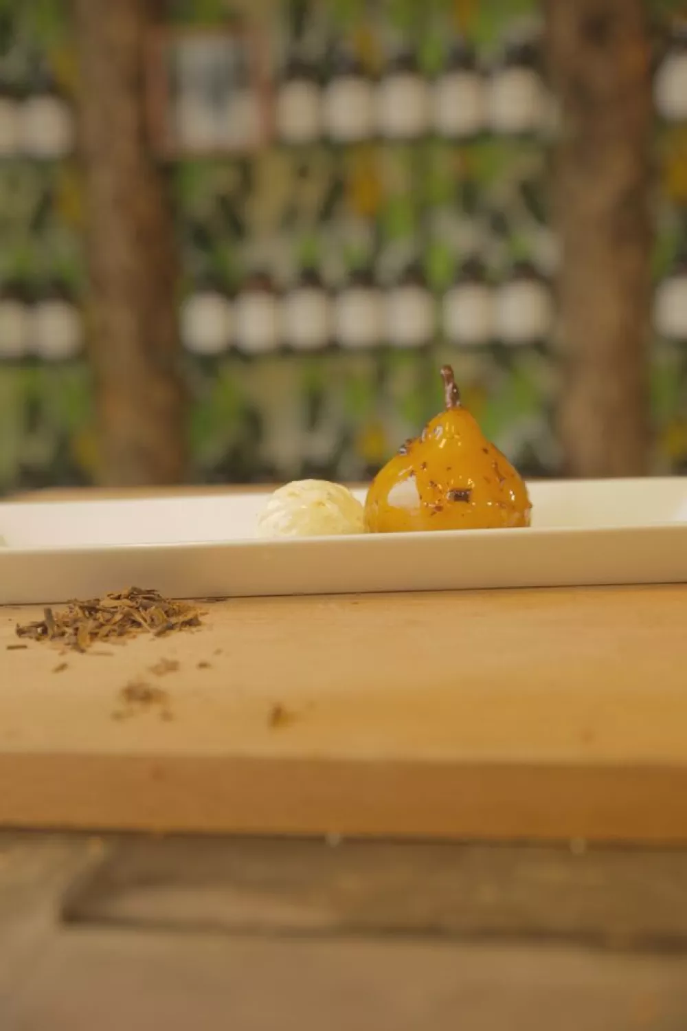 Schik de peertjes mooi op en bord en overgiet met de gekarameliseerde honingsaus. Werk het geheel af met een bolletje vanille ijs.