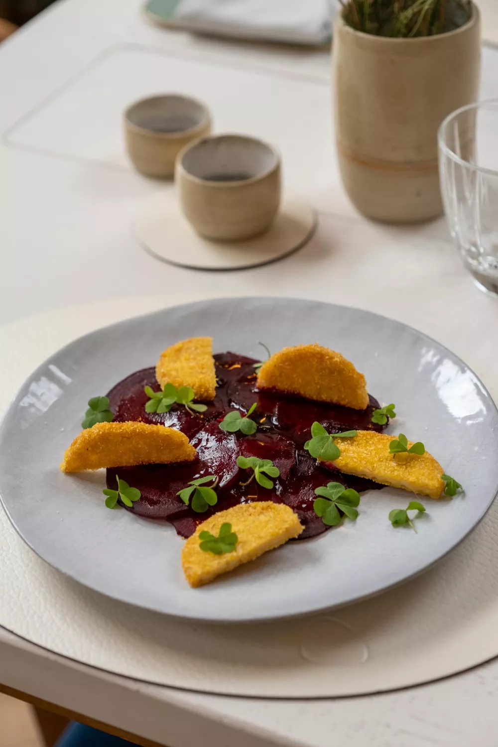 Gepofte rode biet met romige yoghurtcrème en krokante tempeh is een verfijnd plantaardig voorgerecht dat aardse en frisse smaken samenbrengt. De bieten worden langzaam gepoft in de oven, de tempeh krijgt een umami marinade met miso en sojasaus en wordt in polenta gefrituurd tot goudbruin, terwijl bietensap inkookt tot een geconcentreerde zoetzure siroop. Perfect voor een herfstig diner, feestelijk hapje of bij een gezellige borrel.
