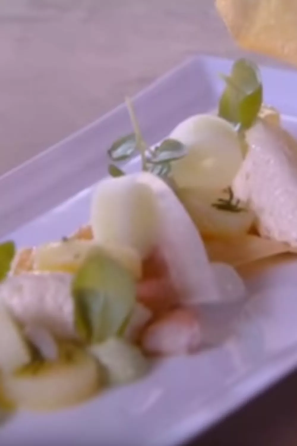 Gerookte Oosterschelde paling gecombineerd met frisse Granny Smith appel en een romige palingmousse brengt zee en fruit samen op het bord. Knapperige kroepoek van rijst en aardappel, in kruidenolie gegaarde mini aardappeltjes en helder appelsap uit de sapcentrifuge zorgen voor textuur en frisheid. Met technieken als melkinfusie, luchtig opkloppen en zorgvuldig frituren is dit visgerecht een elegante, feestelijke amuse voor warme zomeravonden of een verfijnd diner.