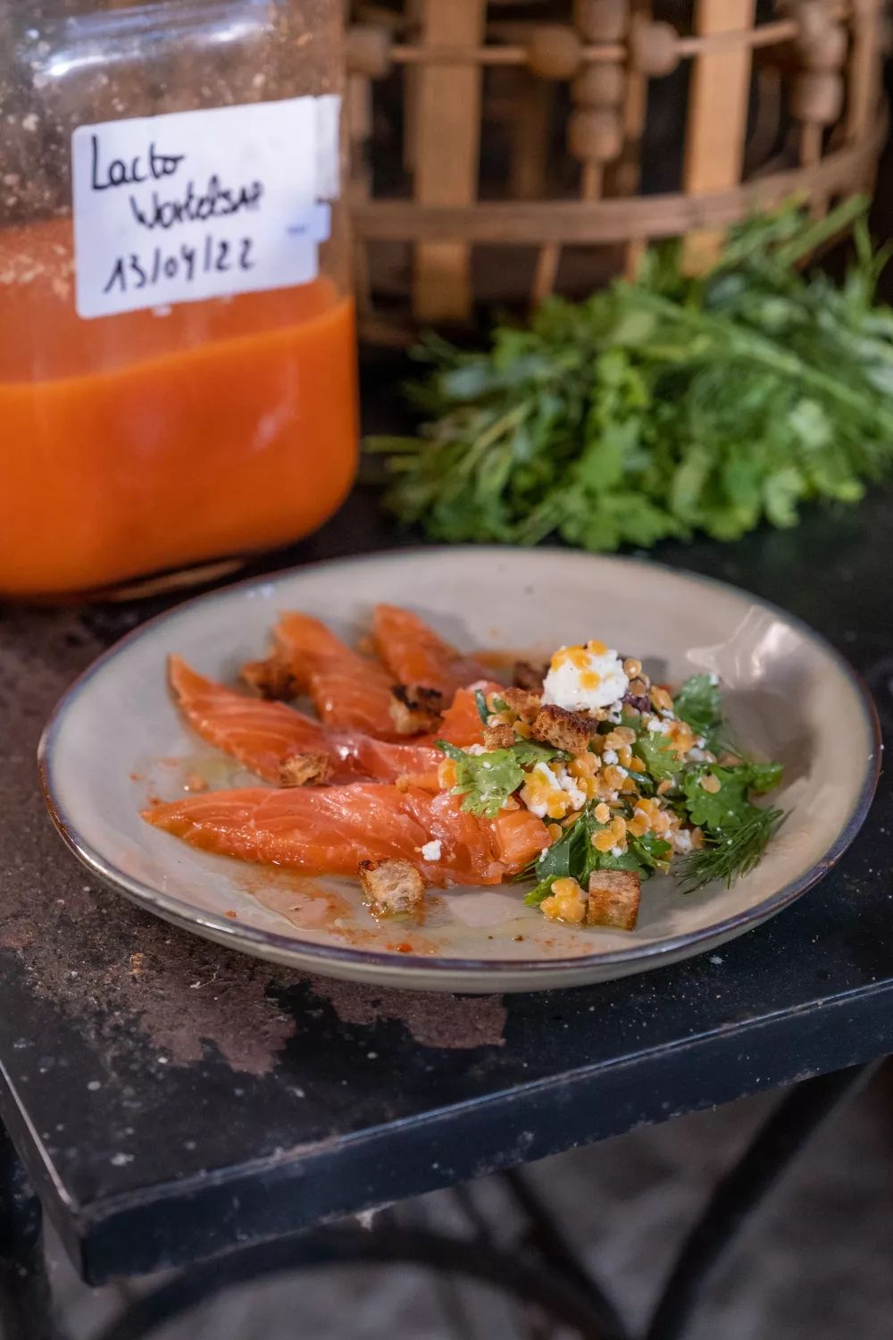 Verdeel de linzensalade over bordjes. Snijd de zalm in plakjes en schik deze bovenop de linzen. Besprenkel met extra vijgenbladolie en gefermenteerd wortelsap. Werk af met de croutons.