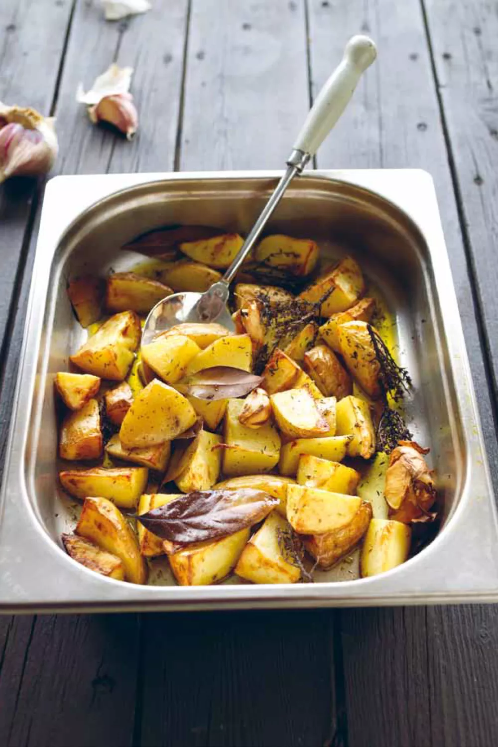 Snij de aardappelen in maantjes en kook ze kort (ongeveer 10 minuten) in gezouten water. Verdeel ze daarna in een vuurvaste schotel en overgiet ze rijkelijk met olijfolie. Kruid met peper en zout, de knoflook, het laurierblad en heel wat verse tijm. Plaats de vuurvaste schaal in de oven en rooster de aardappelen mooi bruin op 180 °C.
