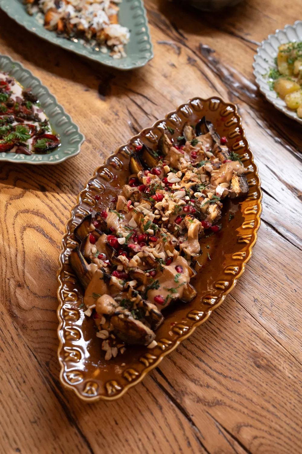 Schik de geroosterde aubergines op een schaal. Lepel er de dressing over. Werk af met granaatappelpitjes, munt en fijngehakte pindanootjes.