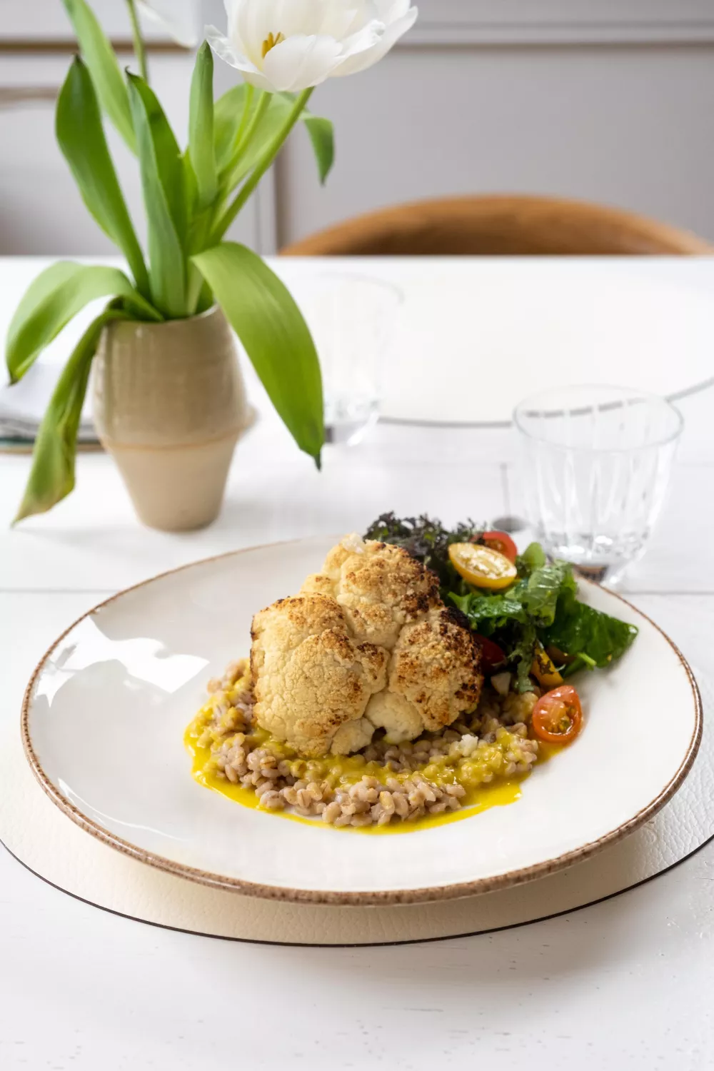 Geroosterde bloemkool met romige parelgerst, pittige pickles en zoete tomaatjes is een verrassend vegetarisch hoofdgerecht vol contrasten in textuur en smaak. De bloemkool krijgt diepte in de oven, de parelgerst suddert zacht met haverroom en de pickles worden gepureerd tot een frisse saus die alles opfrist. Serveer met veldsla en postelein voor een licht lentegevoel of als knus herfstig diner met vrienden.