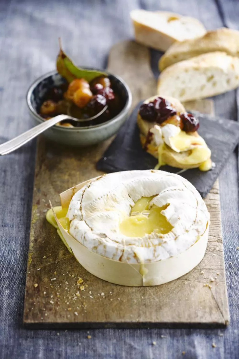 Dip het geroosterde stokbrood in de warme camembert en schep er wat druivencompote op.