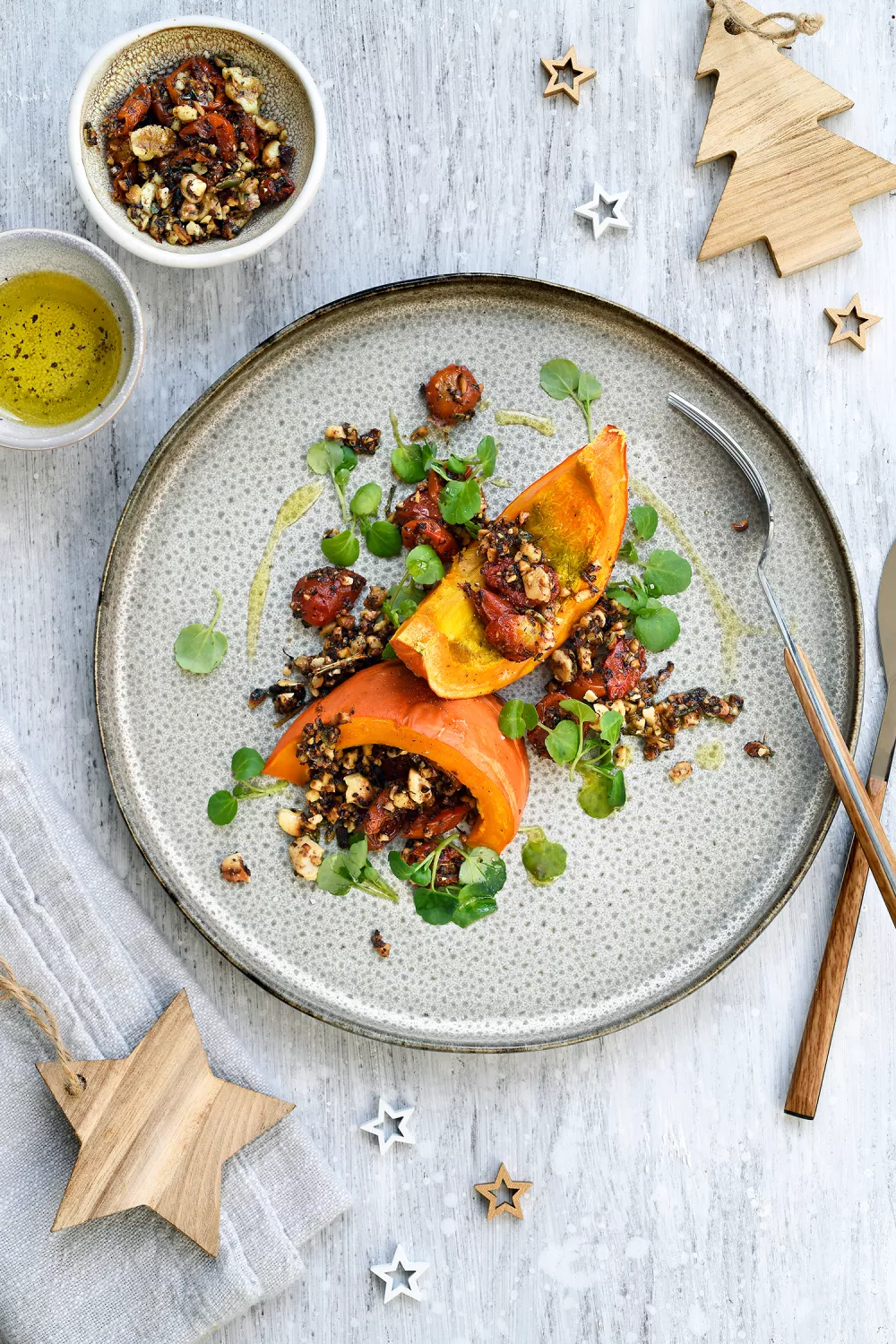Schik telkens twee stukken pompoen mooi op een bord. Lepel er wat van de notencrumble en druppel er wat balsamicoazijn over. Werk af me blaadjes waterkers.