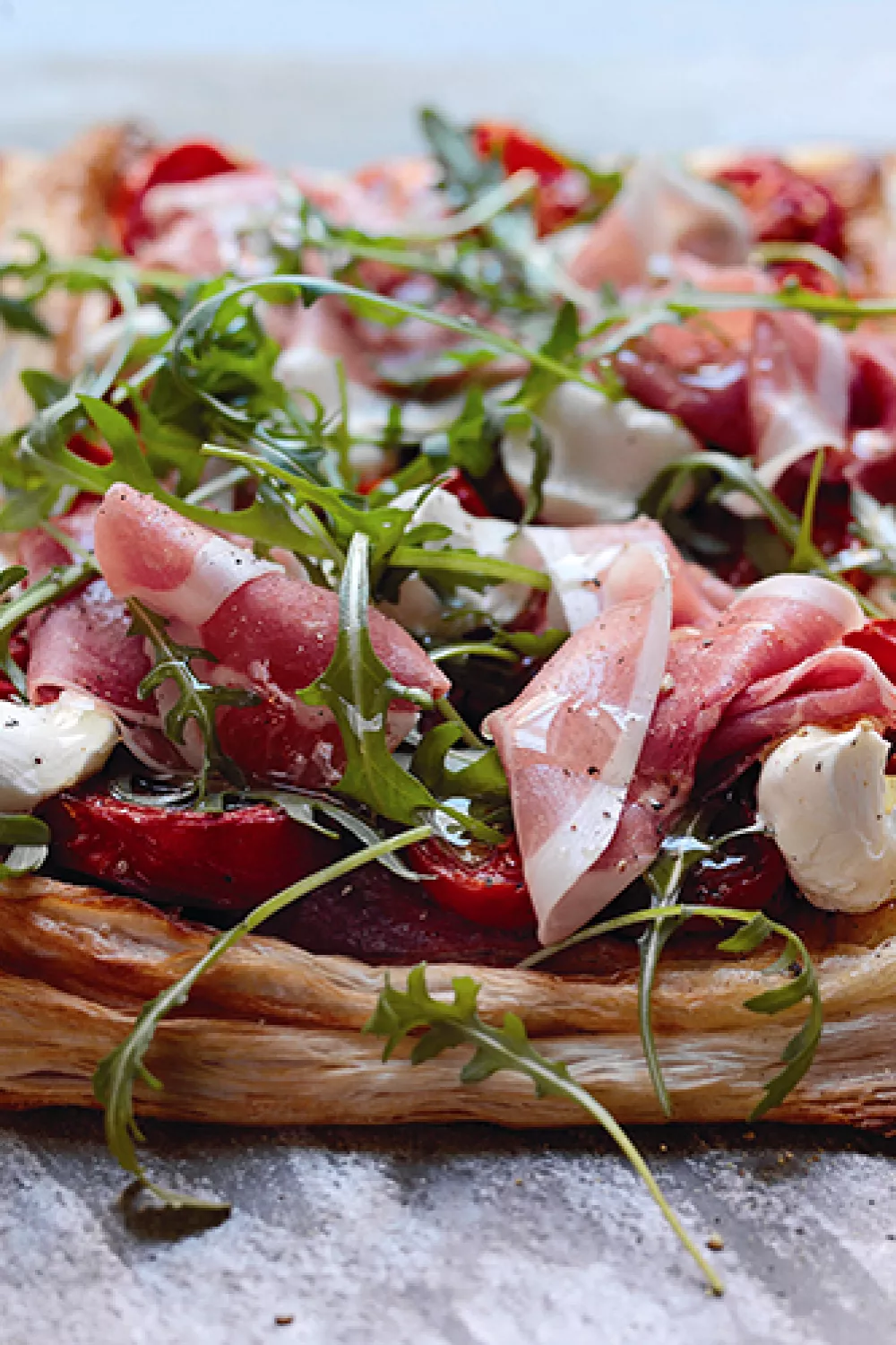 Wanneer de tomaten gaar zijn, verwijder ze uit de oven en verwarm de oven tot 200°. Plaats vervolgens het bladerdeeg in de oven en bak gedurende 15-18 minuten tot het deeg goudbruin ziet. Laat het deeg vervolgens afkoelen en druk de binnenkant van de taart zachtjes naar beneden. Bedek het bladerdeeg met de geroosterde tomaten, enkele lepels mascarpone, rucola en de plakjes Parmaham.