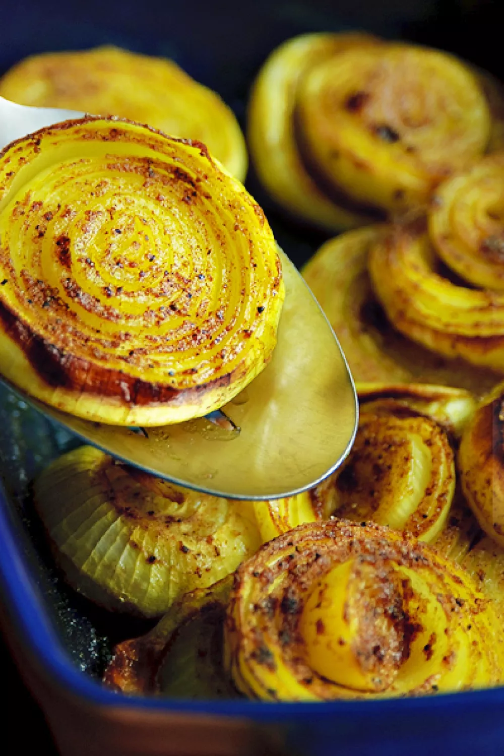 Geroosterde uien uit de oven met warme specerijen en olijfolie, zacht gegaard en licht gekarameliseerd, vormen een eenvoudig maar smaakvol bijgerecht voor herfstige diners. De uien worden met kaneel, gember en kerrie ingesmeerd en langzaam gebakken in een ovenschaal tot ze goudbruin en zoet worden. Dit makkelijke ovenrecept geeft een warme, kruidige toets aan vlees, vis of vegetarische gerechten.