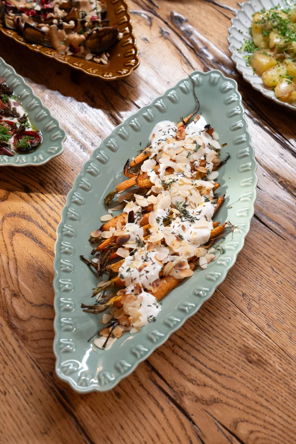 Schep de geroosterde wortelen op een schaal. Verdeel er de yoghurt over. Werk nog af met venkelzaad, amandelschilfers en tijm.