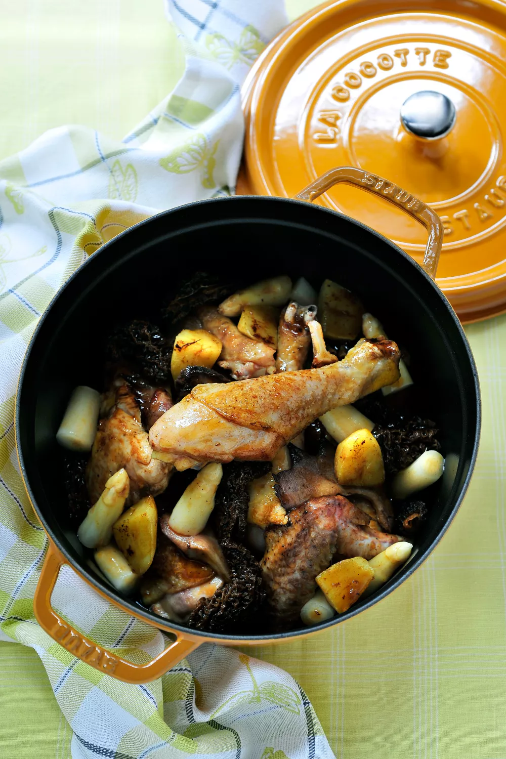 Neem na 20 min. het deksel af van de cocotte en voeg morieljes, asperges, aardappeltjes en hanenkammen toe. Bevochtig met de kippenbouillon en laat nog 10 min. zachtjes sudderen. Proef en kruid eventueel nog wat bij met peper en zout.