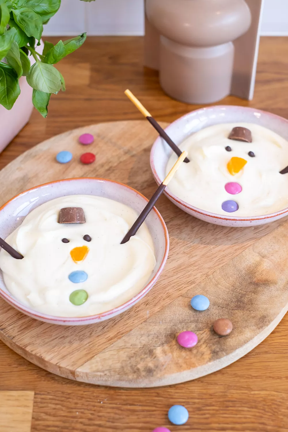 Zacht en romig mascarponedessert met zure room en poedersuiker, waarin het merg van een vanillestokje de smaak verdiept. In een handomdraai roer je alles tot een egale massa, schep je het in kommetjes en versier je het tot vrolijke gesmolten sneeuwmannetjes met mandarijnneusjes, chocoladepastilles, pralinehoedjes en chocoladestokjes. Een feestelijk en kindvriendelijk winterdessert dat perfect past bij kerst of als snel nagerecht.