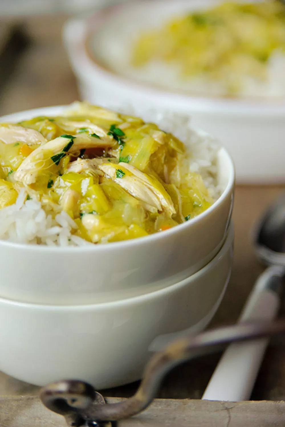 Zacht gesmoorde kip in geurige kerriebouillon met prei, ui en knoflook vormt een romig eenpansgerecht dat naar pure comfortfood ruikt. Het vlees wordt van het bot geplukt en zachtjes nagegaard in een ingedikte saus op basis van maïzena en peterselie, perfect met gestoomde rijst. Ideaal voor een doordeweekse avond of een familiediner in herfst en winter.