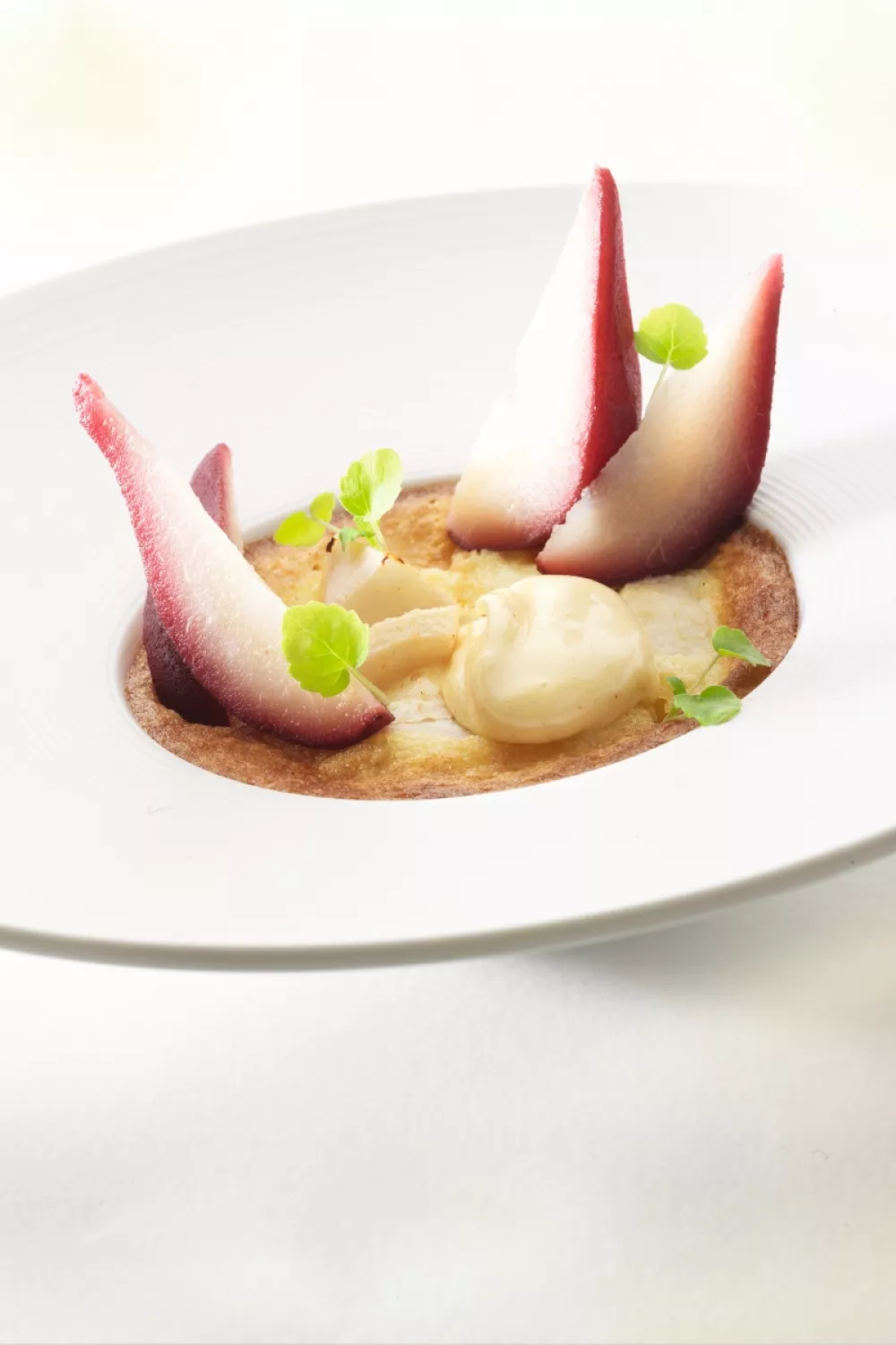Leg de gebakken peertjes op een bord, schep de crème in een spuitzak en spuit een kleine hoeveelheid rond de peertjes. Zet het bord 12 min. in een voorverwarmde oven op 200°C. Werk het geheel af met partjes gestoofde peer, een lepel sabayon en enkele blaadjes zoethout.